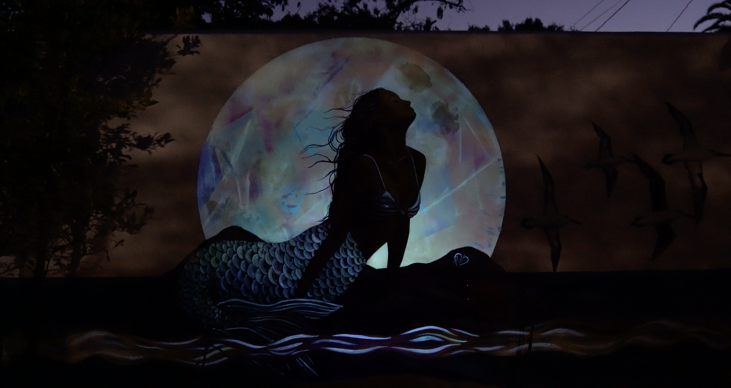 This mural named Luna Sun Meridian symbolizes the harmony between the sun and moon, highlighting their mystical connection. This 8-foot tall by 25-foot long mural took me about a week to complete and features a unique UV twist that transforms the sun into the moon. Additionally, my mermaid is given an enchanting silhouette and glow with invisible UV paint.